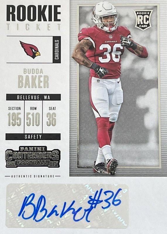 The Budda Baker 2017 Contenders #191 Rookie Ticket Auto card in Raw condition has not changed in price in the last 30 days and was last sold for $29.99 .