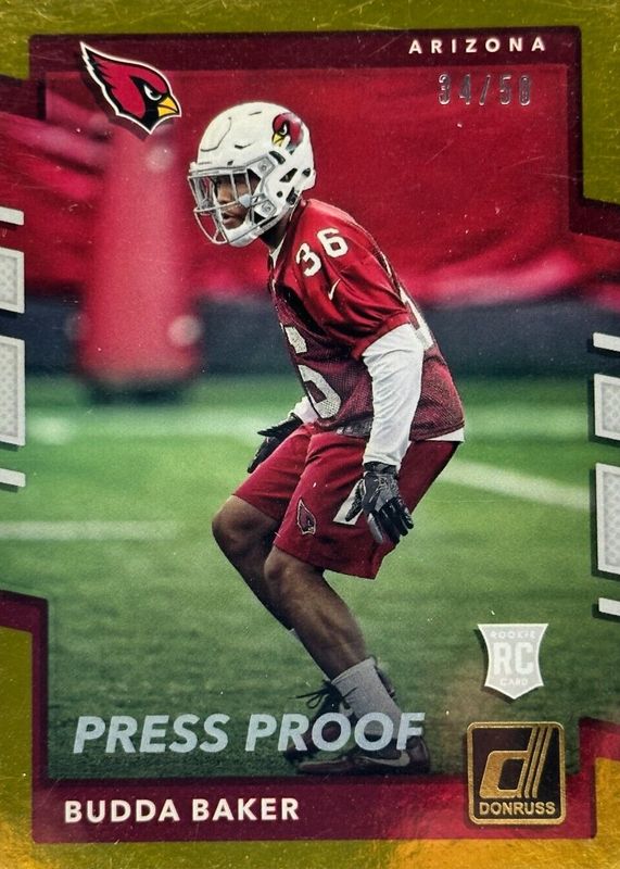 This card is 1 of 14 Budda Baker's card variations in the 2017 Donruss set being tracked by Sports Card Investor, including Base, Aqueous Test, Jersey Number (/36), Press Proof Blue, and Press Proof Bronze.