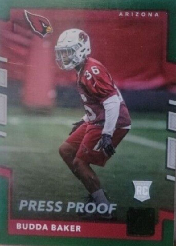The Budda Baker 2017 Donruss #399 Press Proof Green Rookie card in Raw condition has not changed in price in the last 30 days and was last sold for $2.00 .