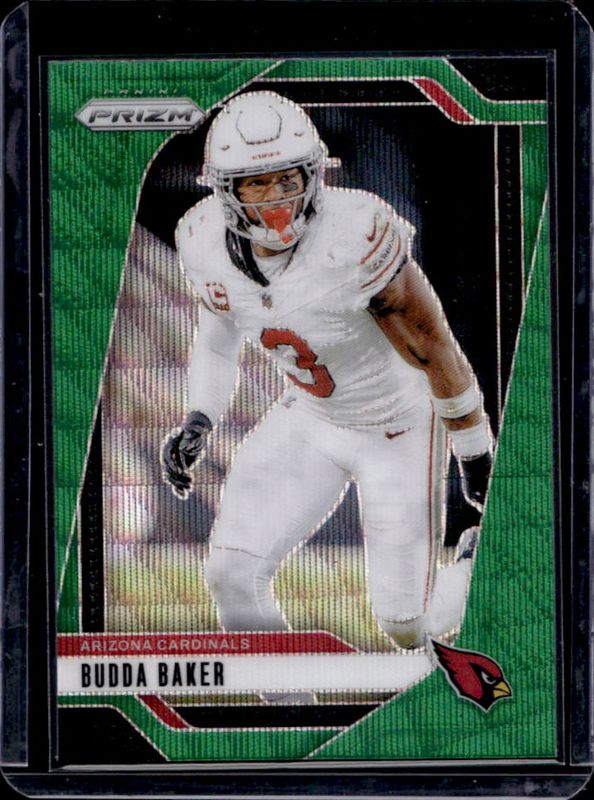 The Budda Baker 2024 Prizm #5 Green Wave card is 1 of 83 Budda Baker's card variations in the 2024 Prizm set being tracked by Sports Card Investor, including Base, Choice Blue Yellow Green, Choice Silver, Disco, and Green.