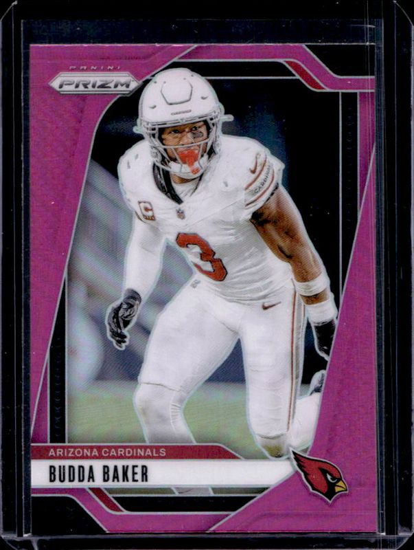 The Budda Baker 2024 Prizm #5 Pink card is 1 of 83 Budda Baker's card variations in the 2024 Prizm set being tracked by Sports Card Investor, including Base, Choice Blue Yellow Green, Choice Silver, Disco, and Green.