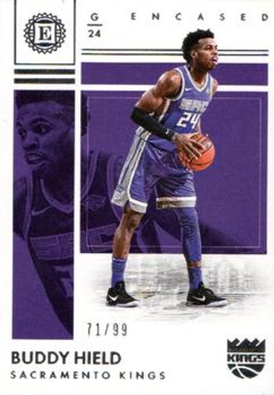 The Buddy Hield 2017 Encased #62 Base /99 card is 1 of 9 Buddy Hield's card variations in the 2017 Encased set being tracked by Sports Card Investor, including Red /25, Gold /10, Green /5, Platinum /1, and Dual Jerseys /99.