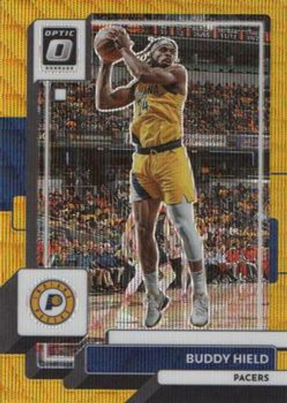 The Buddy Hield 2022 Optic #95 Gold Wave /10 card is 1 of 58 Buddy Hield's card variations in the 2022 Optic set being tracked by Sports Card Investor, including Base, Checkerboard, Choice Red & Green, Fast Break, and Green Shock.