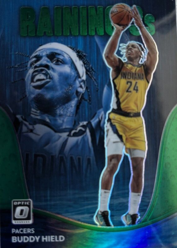 The Buddy Hield 2022 Optic #3 Raining 3s - Green /5 card in Raw condition has not changed in price in the last 30 days and was last sold for $40.00 .