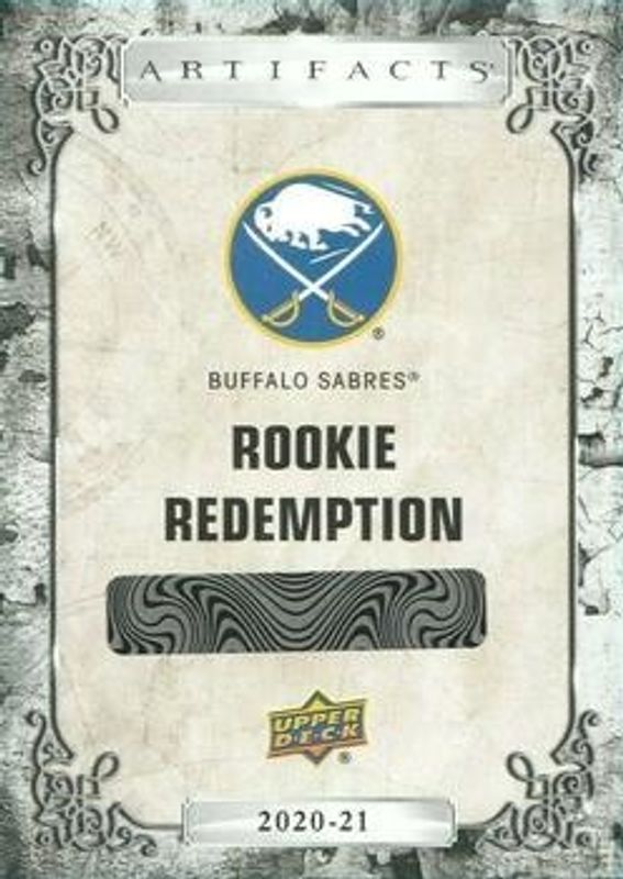 The Buffalo Sabres 2020 Upper Deck Artifacts #RED184 Rookie Redemptions card is 1 of 2 Buffalo Sabres' card variations in the 2020 Upper Deck Artifacts set being tracked by Sports Card Investor, including Rookie Redemptions - Emerald.