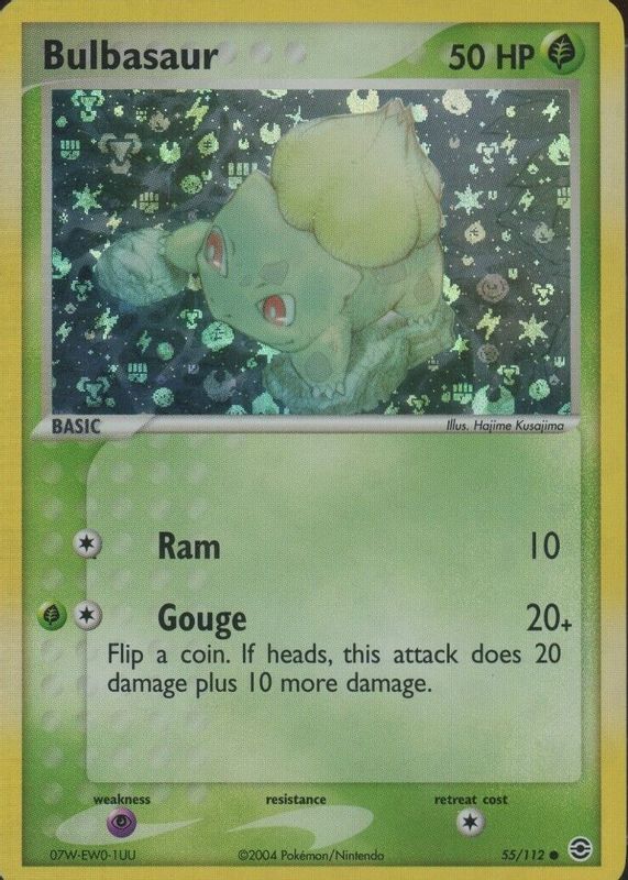The Bulbasaur 2004 EX: FireRed & LeafGreen #055/112 Reverse Holo card in Raw TCG (Near Mint) condition has moved up $25.00 (+20.0%) in the last 30 days and was last sold for $150.00 .