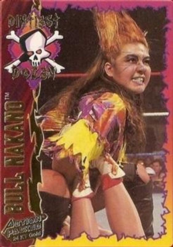The Bull Nakano 1995 Action Packed WWF #11G 24 Kt. Gold card is 1 of 2 Bull Nakano's card variations in the 1995 Action Packed WWF set being tracked by Sports Card Investor, including Base.