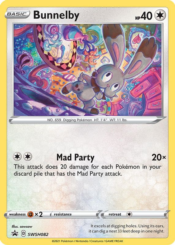 The Bunnelby 2021 Sword & Shield: Black Star Promo #SWSH082 Pin Collection (Shining Fates Mad Party) card in Raw TCG (Near Mint) condition has moved up $0.65 (+48.0%) in the last 30 days and was last sold for $1.99 .
