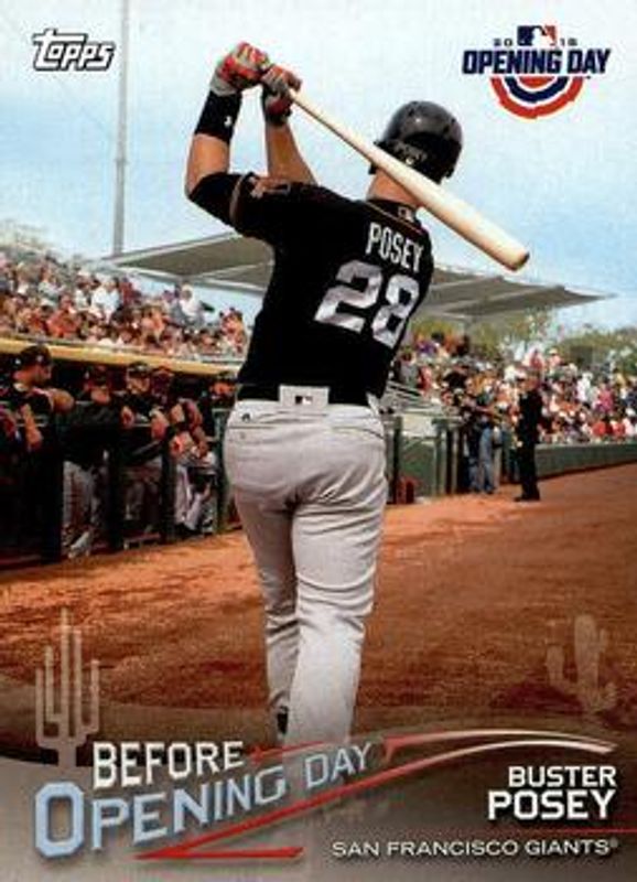 The Buster Posey 2018 Topps Opening Day #BOD-BP Before Opening Day card is 1 of 14 Buster Posey's card variations in the 2018 Topps Opening Day set being tracked by Sports Card Investor, including #5b Base, #5 Base, #5 Opening Day Edition Blue Foil, #5 Purple, and #5 5x7 /49.