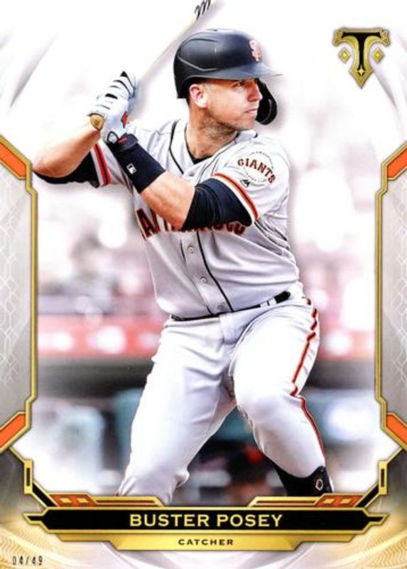 The Buster Posey 2019 Topps Triple Threads #64 Base 5x7 /49 card is 1 of 70 Buster Posey's card variations in the 2019 Topps Triple Threads set being tracked by Sports Card Investor, including Base, Amethyst /299, Emerald /259, Amber /199, and Gold /99.