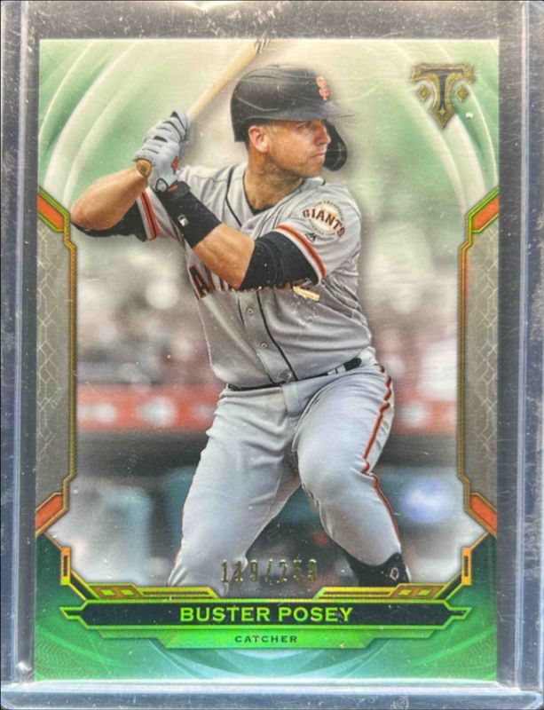 The Buster Posey 2019 Topps Triple Threads #64 Emerald /259 card is 1 of 70 Buster Posey's card variations in the 2019 Topps Triple Threads set being tracked by Sports Card Investor, including Base, Amethyst /299, Amber /199, Gold /99, and Citrine /75.