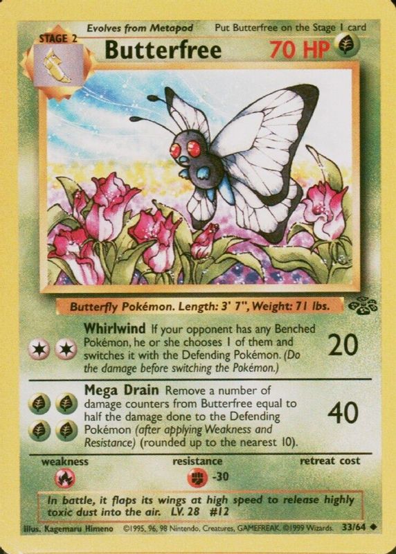The Butterfree 1999 Jungle #33/64 Unlimited card in Raw TCG (Near Mint) condition has moved up $2.14 (+115%) in the last 30 days and was last sold for $4.00 .