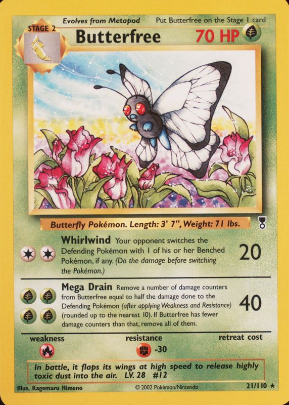 The Butterfree 2002 Legendary Collection #21 Base card in Raw TCG (Near Mint) condition has not changed in price in the last 30 days and was last sold for $5.00 .
