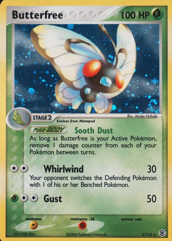 The Butterfree 2004 EX: FireRed & LeafGreen #002/112 Holo card in Raw TCG (Near Mint) condition has moved down -$5.95 (-29.8%) in the last 30 days and was last sold for $14.00 .