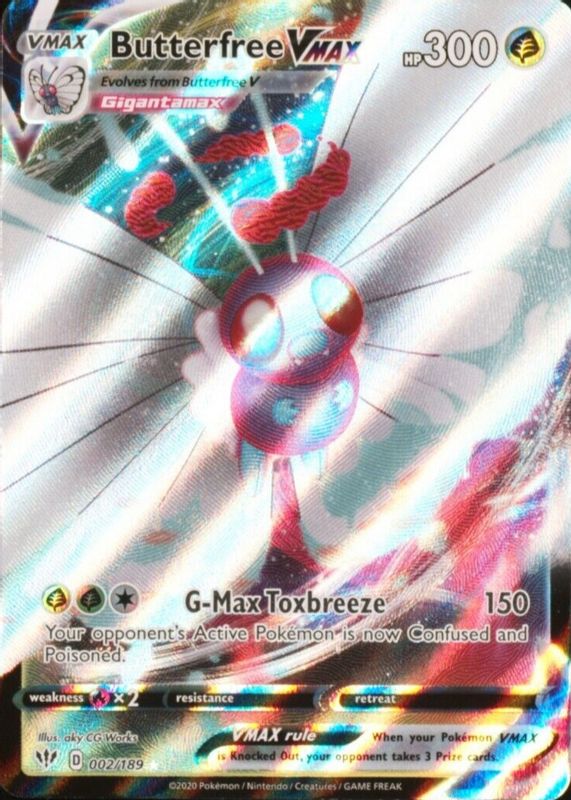 The Butterfree VMAX 2020 Sword & Shield: Darkness Ablaze #002/189 Holo card in Raw TCG (Near Mint) condition has moved up $5.19 (+149%) in the last 30 days and was last sold for $8.68 .