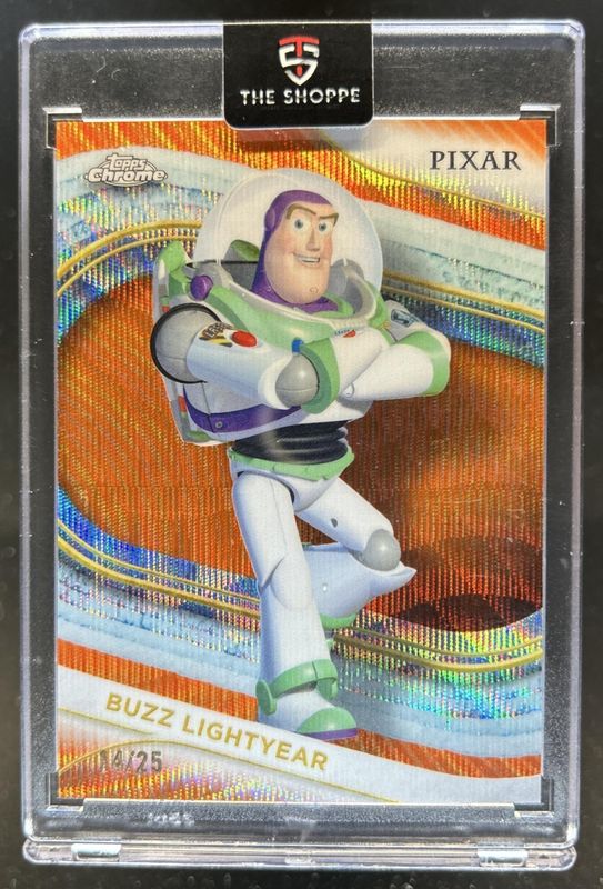 The Buzz Lightyear 2025 Topps Chrome Disney #90 Orange Wave Refractor /25 card is 1 of 48 Buzz Lightyear's card variations in the 2025 Topps Chrome Disney set being tracked by Sports Card Investor, including Base, Mini Diamonds Refractor, Prism Refractor, Refractor, and Yellow Mini Diamonds Refractor.