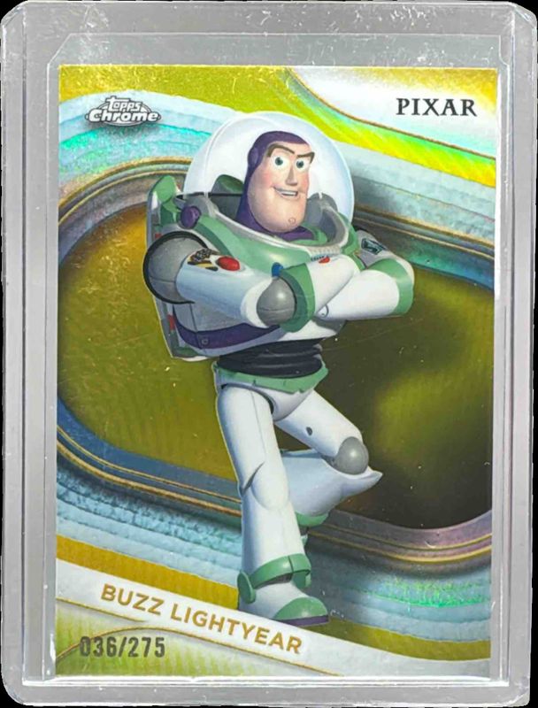 The Buzz Lightyear 2025 Topps Chrome Disney #90 Yellow Refractor /275 card is 1 of 48 Buzz Lightyear's card variations in the 2025 Topps Chrome Disney set being tracked by Sports Card Investor, including Base, Mini Diamonds Refractor, Prism Refractor, Refractor, and Yellow Mini Diamonds Refractor.