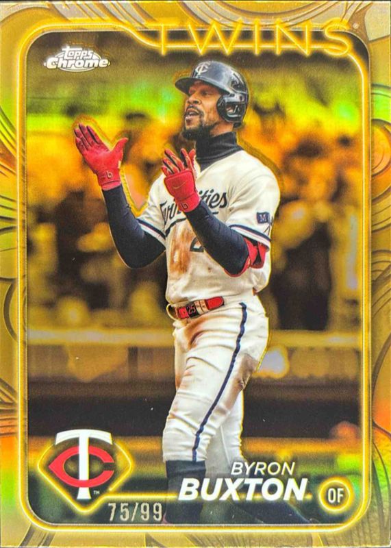 The Byron Buxton 2024 Topps Gilded Collection #117 Base /99 card is 1 of 7 Byron Buxton's card variations in the 2024 Topps Gilded Collection set being tracked by Sports Card Investor, including Gold Wave Refractor /75, Mini-Diamond Refractor /50, Gold RayWave Refractor /25, Gold Lava Refractor /10, and Electroplate Refractor /5.