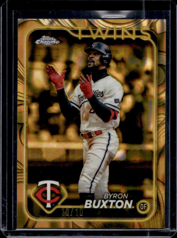 The Byron Buxton 2024 Topps Gilded Collection #117 Gold Lava Refractor /10 card is 1 of 7 Byron Buxton's card variations in the 2024 Topps Gilded Collection set being tracked by Sports Card Investor, including Base /99, Gold Wave Refractor /75, Mini-Diamond Refractor /50, Gold RayWave Refractor /25, and Electroplate Refractor /5.