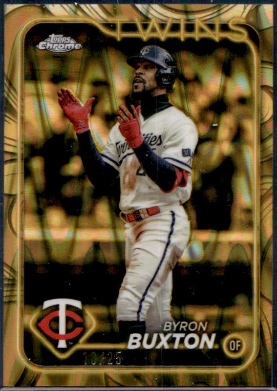 The Byron Buxton 2024 Topps Gilded Collection #117 Gold RayWave Refractor /25 card is 1 of 7 Byron Buxton's card variations in the 2024 Topps Gilded Collection set being tracked by Sports Card Investor, including Base /99, Gold Wave Refractor /75, Mini-Diamond Refractor /50, Gold Lava Refractor /10, and Electroplate Refractor /5.