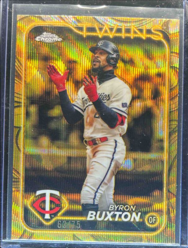 The Byron Buxton 2024 Topps Gilded Collection #117 Gold Wave Refractor /75 card is 1 of 7 Byron Buxton's card variations in the 2024 Topps Gilded Collection set being tracked by Sports Card Investor, including Base /99, Mini-Diamond Refractor /50, Gold RayWave Refractor /25, Gold Lava Refractor /10, and Electroplate Refractor /5.