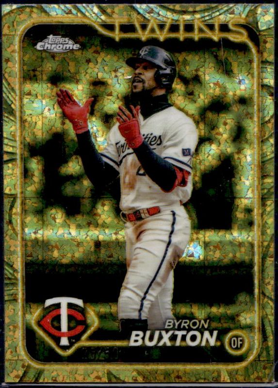 The Byron Buxton 2024 Topps Gilded Collection #117 Mini-Diamond Refractor /50 card is 1 of 7 Byron Buxton's card variations in the 2024 Topps Gilded Collection set being tracked by Sports Card Investor, including Base /99, Gold Wave Refractor /75, Gold RayWave Refractor /25, Gold Lava Refractor /10, and Electroplate Refractor /5.