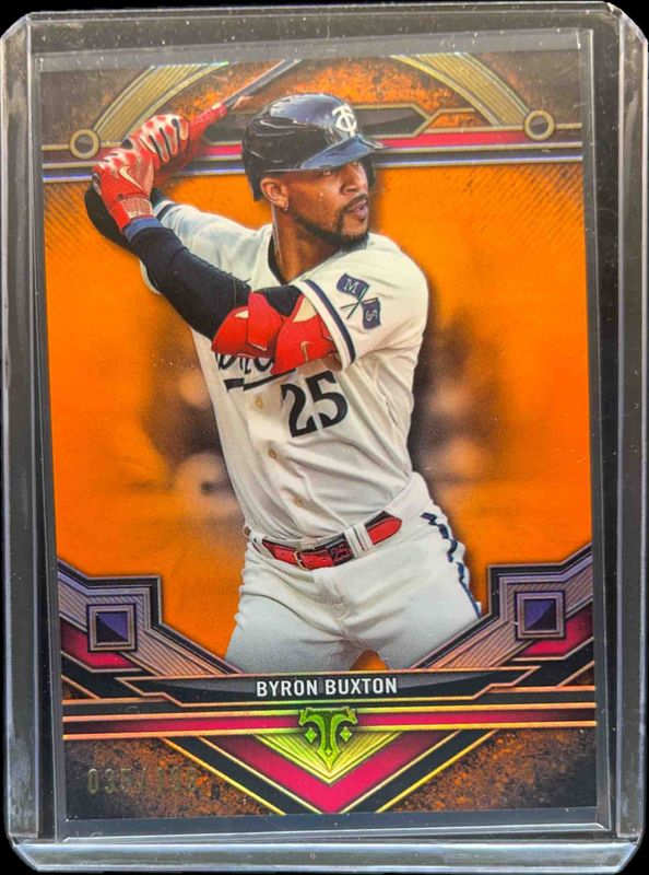 The Byron Buxton 2024 Topps Triple Threads #179 Amber /199 card is 1 of 76 Byron Buxton's card variations in the 2024 Topps Triple Threads set being tracked by Sports Card Investor, including Base, Aquamarine /149, Tourmaline /125, Gold /99, and Citrine /75.