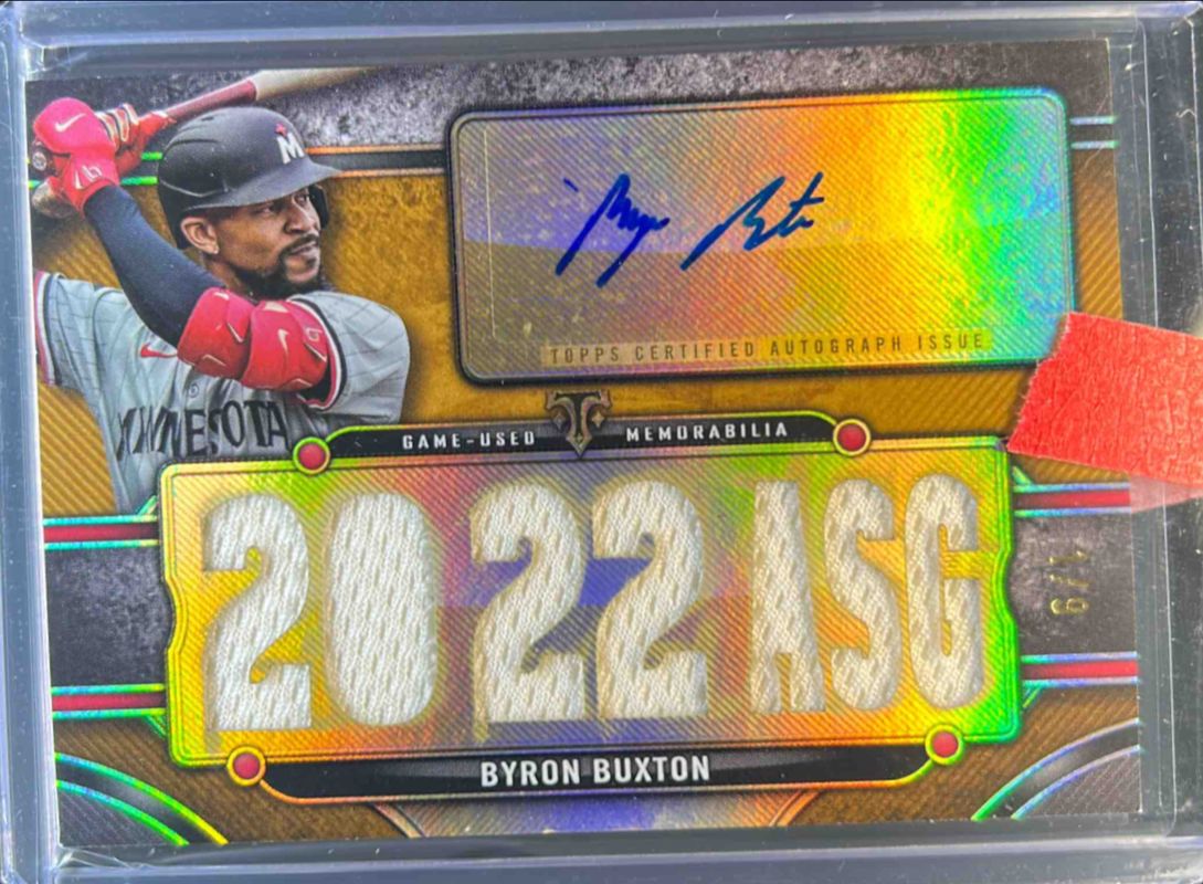 The Byron Buxton 2024 Topps Triple Threads #TTAR-BB1 Autographs Relics - Gold /9 card is 1 of 76 Byron Buxton's card variations in the 2024 Topps Triple Threads set being tracked by Sports Card Investor, including Base, Amber /199, Aquamarine /149, Tourmaline /125, and Gold /99.