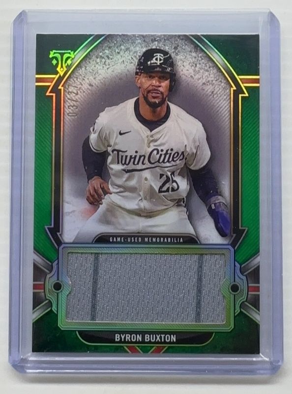 The Byron Buxton 2024 Topps Triple Threads #SJR-BBU Single Jumbo Relics - Emerald /27 card is 1 of 76 Byron Buxton's card variations in the 2024 Topps Triple Threads set being tracked by Sports Card Investor, including Base, Amber /199, Aquamarine /149, Tourmaline /125, and Gold /99.