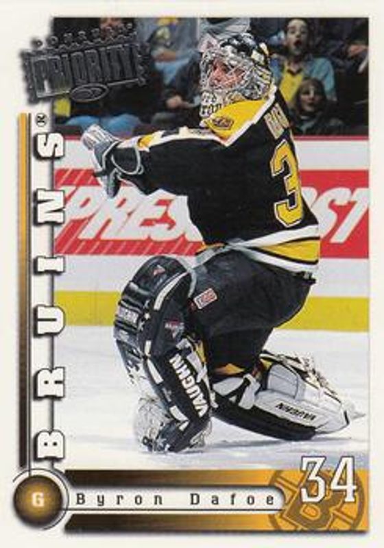 The Byron Dafoe 1997 Donruss Priority #104 Base Rookie card is 1 of 4 Byron Dafoe's card variations in the 1997 Donruss Priority set being tracked by Sports Card Investor, including Postmaster Generals Promos, Stamp of Approval /100, and Postmaster Generals /1500.