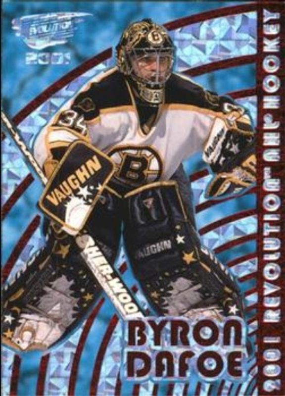 The Byron Dafoe 2000 Pacific Revolution #10 Red /99 card is 1 of 4 Byron Dafoe's card variations in the 2000 Pacific Revolution set being tracked by Sports Card Investor, including Base, Shadow Series Blue /85, and Premiere Date /60.