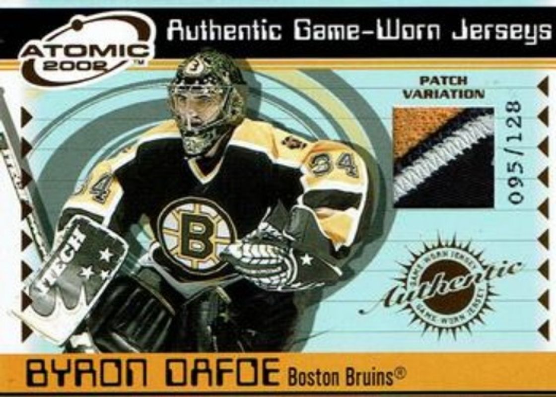 The Byron Dafoe 2001 Pacific Atomic #3 Patches /403 card is 1 of 7 Byron Dafoe's card variations in the 2001 Pacific Atomic set being tracked by Sports Card Investor, including Base /500, Red /290, Gold /200, Premiere Date /90, and Blue /9.