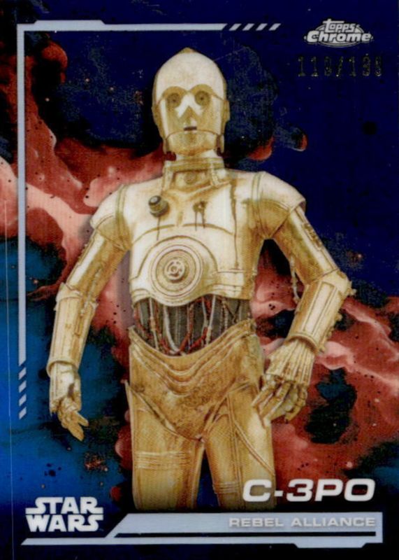 This card is 1 of 18 C-3PO's card variations in the 2024 Topps Chrome Star Wars set being tracked by Sports Card Investor, including Blue Blaster Pulsar Refractor, Rainbow Refractor, Red Blaster RayWave Refractor, Skywalker Blue Refractor /150, and Aurebesh Variation /99.