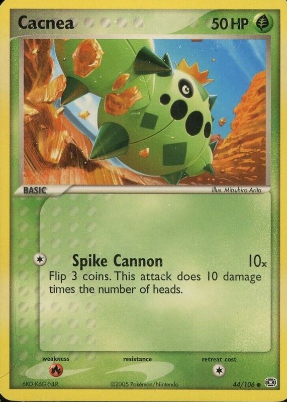 The Cacnea 2005 EX: Emerald #044/106 Base card in Raw TCG (Near Mint) condition has moved up $3.10 (+237%) in the last 30 days and was last sold for $4.41 .