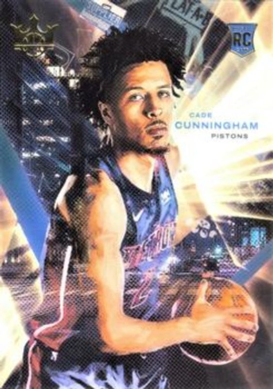 The Cade Cunningham 2021 Court Kings #77 Base Rookie card is 1 of 55 Cade Cunningham's card variations in the 2021 Court Kings set being tracked by Sports Card Investor, including #143 Base, #176 Base, #110 Base, #77 Rookies I, and #110 Rookies II.
