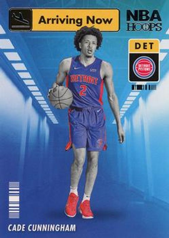 The Cade Cunningham 2021 Hoops #1 Arriving Now Rookie card is 1 of 48 Cade Cunningham's card variations in the 2021 Hoops set being tracked by Sports Card Investor, including Base, Anniversary Edition, Blue, Green Ice, and Hyper Blue.