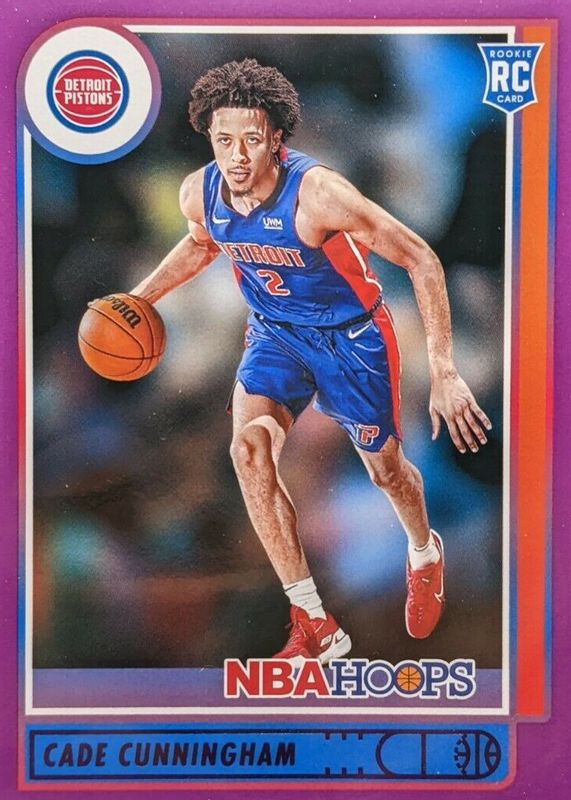 The Cade Cunningham 2021 Hoops #201 Purple Rookie card in Raw condition has moved up $1.01 (+102%) in the last 30 days and was last sold for $2.00 .