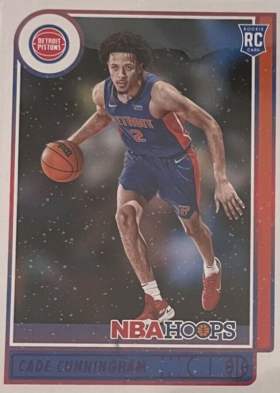 The Cade Cunningham 2021 Hoops #201 Purple Winter Rookie card in Raw condition has not changed in price in the last 30 days and was last sold for $0.99 .