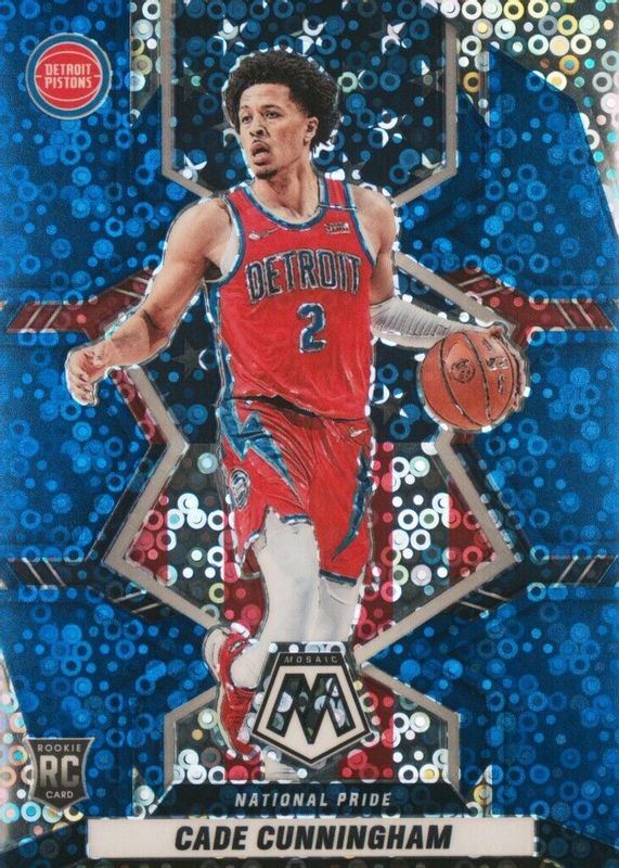 The Cade Cunningham 2021 Mosaic #260 National Pride - Fast Break Blue /85 Rookie card in Raw condition has not changed in price in the last 30 days and was last sold for $34.00 .
