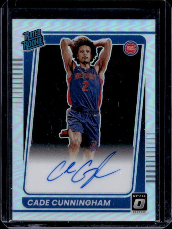 The Cade Cunningham 2021 Optic #161 Rated Rookie Signatures - Holo card is 1 of 106 Cade Cunningham's card variations in the 2021 Optic set being tracked by Sports Card Investor, including Base, Blue Pulsar, Blue Velocity, Checkerboard, and Choice.