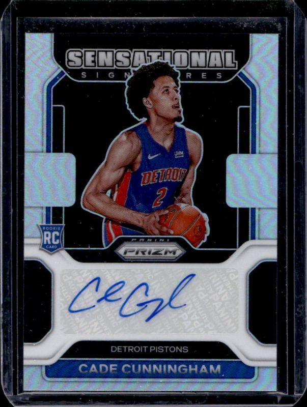 The Cade Cunningham 2021 Prizm #SS-CCU Sensational Signatures - Silver Rookie card is 1 of 102 Cade Cunningham's card variations in the 2021 Prizm set being tracked by Sports Card Investor, including #282b Base, #282 Base, #282 Photo Variation, #282 Blue NBA 75th Anniversary, and #282 Blue Wave.