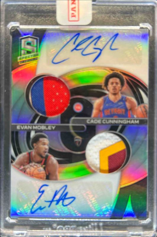 The Cade Cunningham 2021 Spectra #RDP-CEM Rookie Dual Patch Autographs /25 card is 1 of 78 Cade Cunningham's card variations in the 2021 Spectra set being tracked by Sports Card Investor, including #102 Base, #102b Base, #203 Base, #203 75th Anniversary, and #102 75th Anniversary.