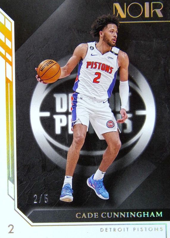 This card is 1 of 13 Cade Cunningham's card variations in the 2022 Noir set being tracked by Sports Card Investor, including Association Edition /99, Icon Edition /99, Statement Edition /25, Association Edition - Holo Silver /49, and Icon Edition - Holo Silver /49.