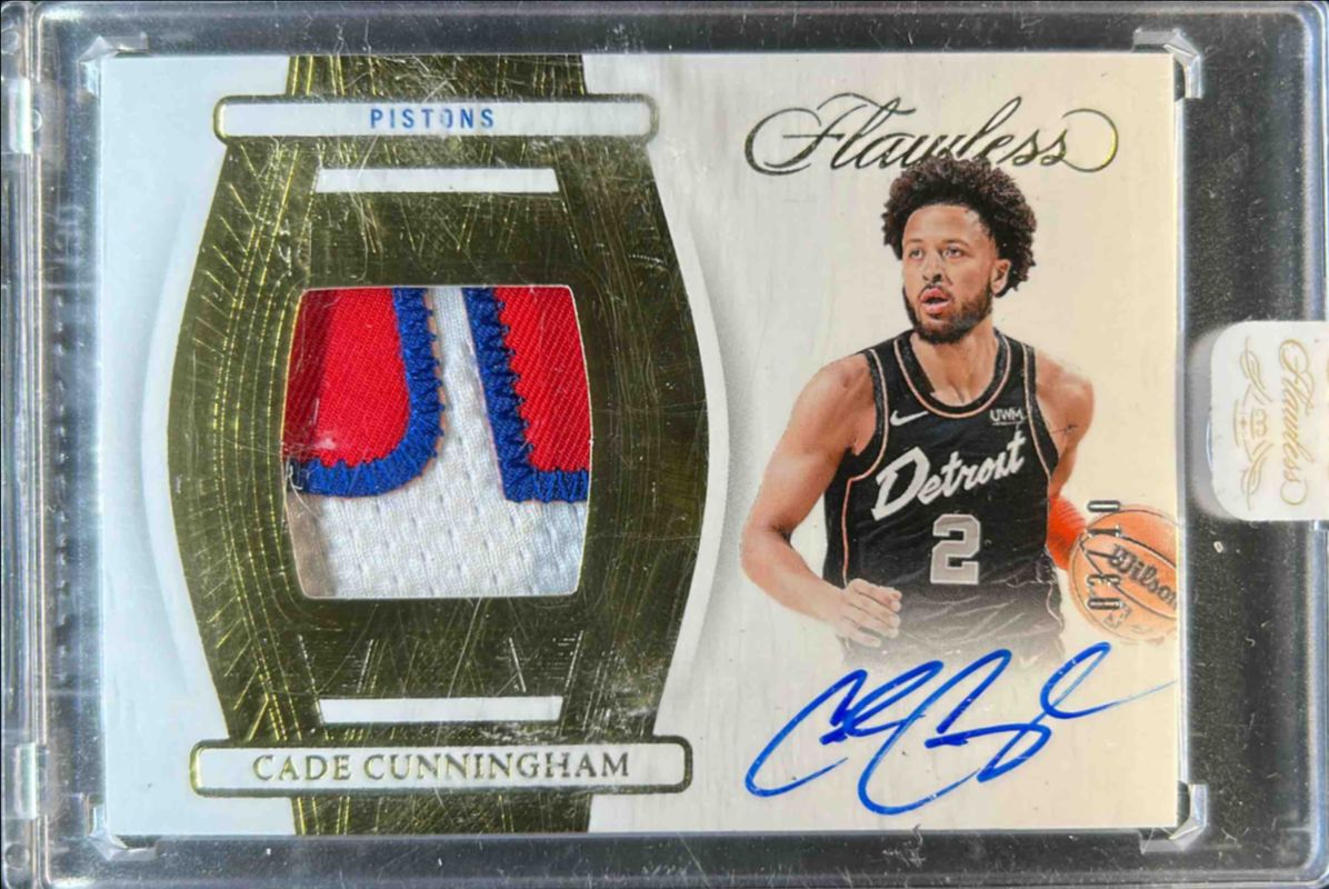 The Cade Cunningham 2023 Flawless #FPA- Flawless Patch Autographs - Gold /10 card is 1 of 40 Cade Cunningham's card variations in the 2023 Flawless set being tracked by Sports Card Investor, including Base /20, Gold /10, Emerald /5, Bronze /3, and Platinum /1.