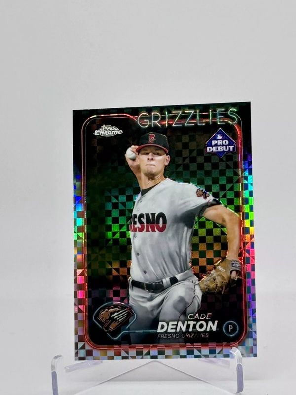 The Cade Denton 2024 Topps Pro Debut #PDC-86 Chrome - X-Fractor card is 1 of 22 Cade Denton's card variations in the 2024 Topps Pro Debut set being tracked by Sports Card Investor, including Base, Fuchsia Foil /199, Sparkle Foil /175, Blue Foil /150, and Green Foil /99.