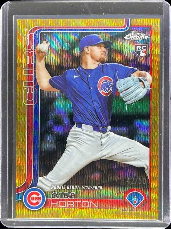 The Cade Horton 2025 Topps Chrome Update #USC102 Gold Wave Refractor /50 Rookie card is 1 of 183 Cade Horton's card variations in the 2025 Topps Chrome Update set being tracked by Sports Card Investor, including #USC102 Base, #USC63 Base, #USC102 Rookie Debut, #USC102 Geometric Refractor, and #USC63 Geometric Refractor.