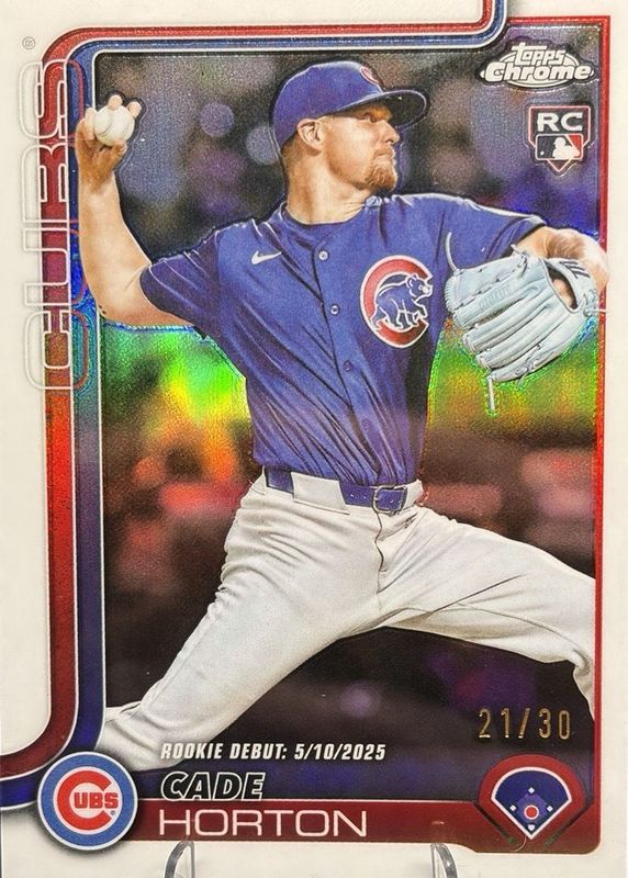 The Cade Horton 2025 Topps Chrome Update #USC102 Rookie Debut - White Refractor /30 card in Raw condition has not changed in price in the last 30 days and was last sold for $65.00 .