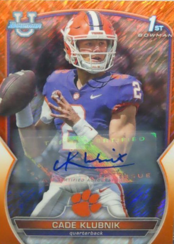 Auctions Ending Soon for Cade Klubnik 2022 Bowman Chrome University #42 Prospect Auto - Orange Shimmer Refractor /25 (1st) RAW