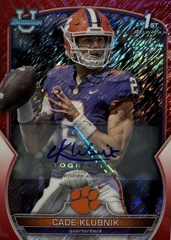 This card is 1 of 12 Cade Klubnik's card variations in the 2022 Bowman Chrome University set being tracked by Sports Card Investor, including Prospect Auto (1st), Prospect Auto - Refractor /499 (1st), Prospect Auto - Lava Refractor /199 (1st), Prospect Auto - Green Refractor /99 (1st), and Prospect Auto - Yellow Refractor /75 (1st).