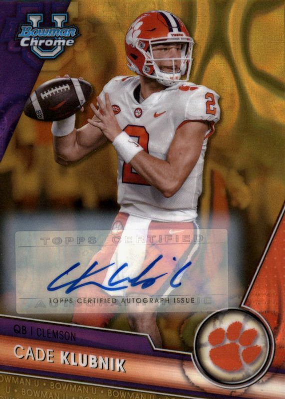 This card is 1 of 25 Cade Klubnik's card variations in the 2023 Bowman Chrome University set being tracked by Sports Card Investor, including Prospects - SP Variation, Prospect Auto, Prospect Auto - Refractor /499, Prospect Auto - Fuchsia Mini-Diamond Refractor /150, and The Big Kahuna Autographs /150.
